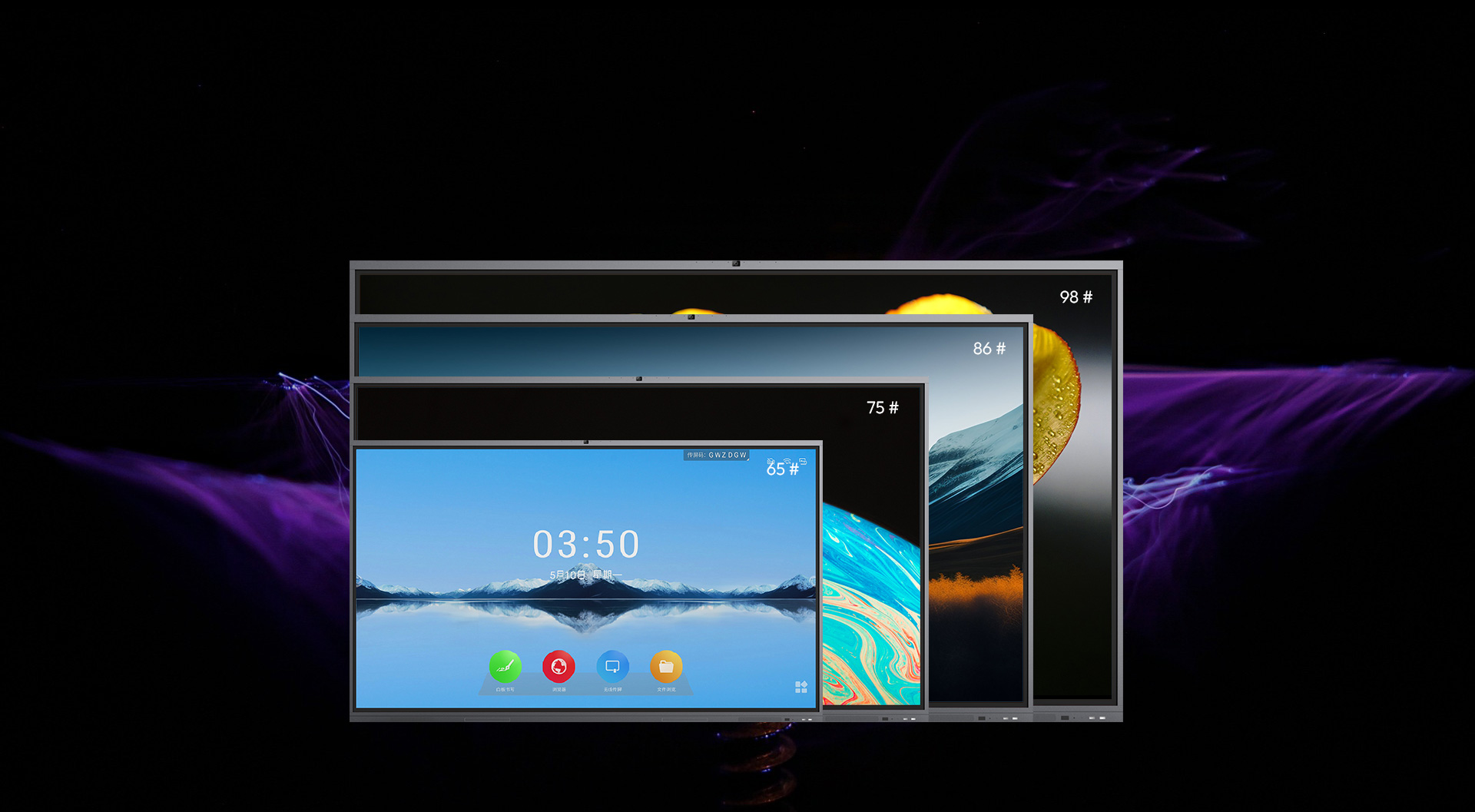 65/75/86/98吋多尺寸,壁挂安装,移动底座可选,满足各类会议需求。